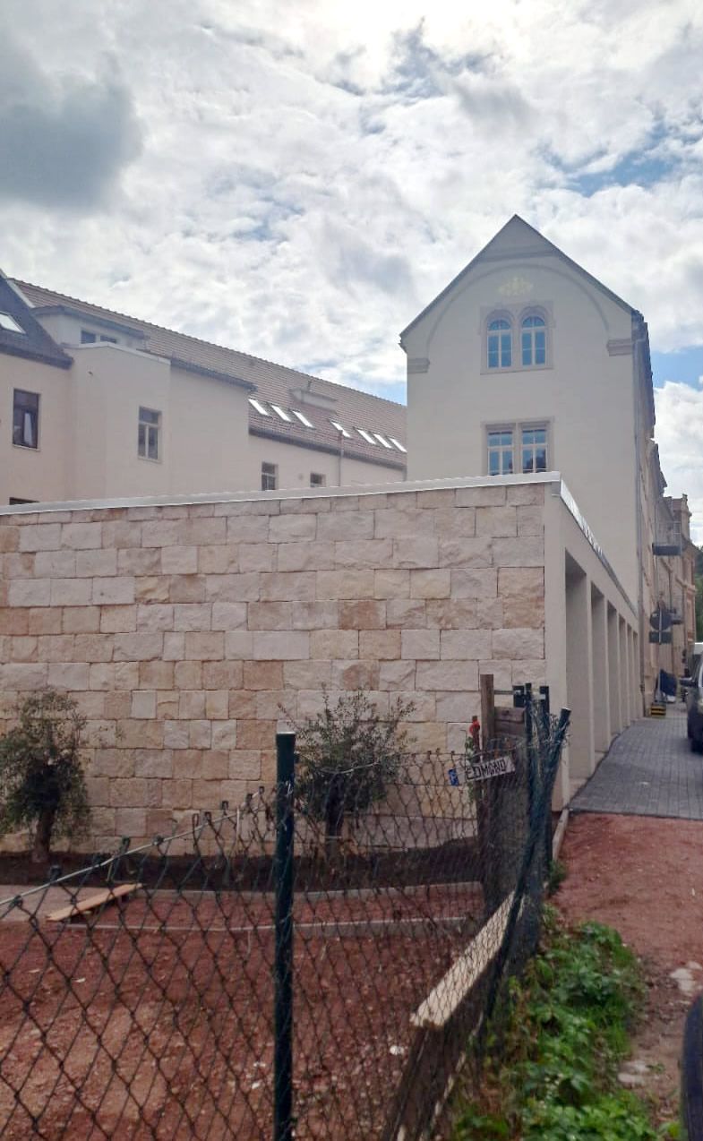 Die Fassade der Talstr. 87 komplettiert den Gebäudezug gegenüber dem Porzellanmuseum. Sie ist ebenfalls saniert und besticht durch den Sandsteinbalkon mit schmiedeeisernem Geländer und den behelmten Hausfiguren.